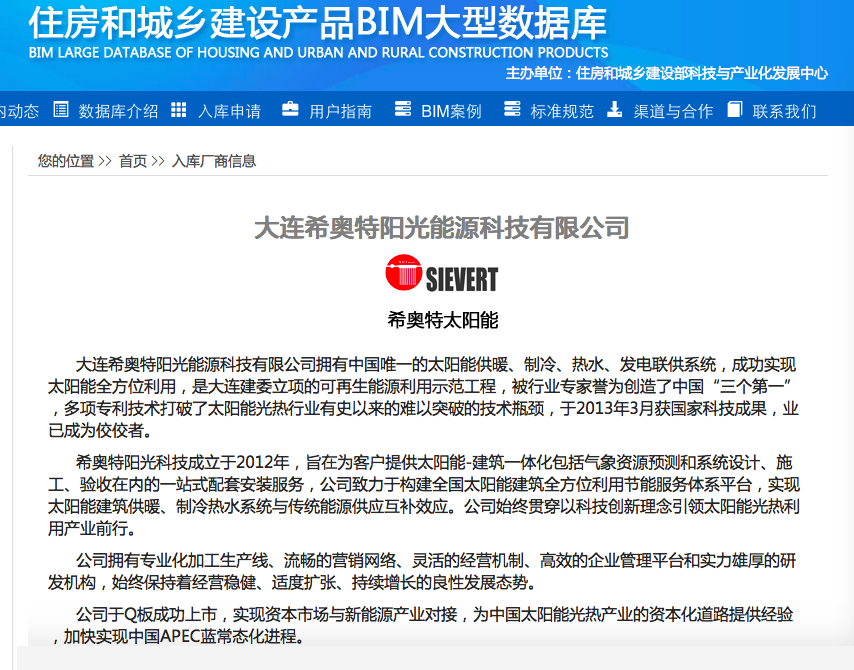 希奧特太陽能熱水器入編住房和城鄉建設產品BIM大型數據庫